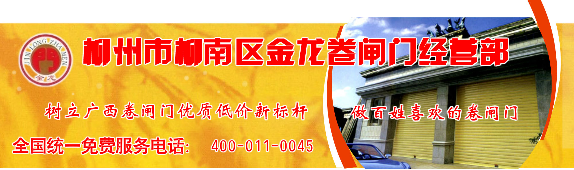 柳州市金龙卷闸门经营部地处广西工业重镇柳州市,坐落于柳南区航军路中段,交通、物流非常便利。我部是生产和销售彩钢和不锈钢澳式卷闸门;铝合金和彩钢欧式卷闸门及卷闸门零配件的专业商家。凭借十多年的制造经验,雄厚的技术力量和完善的售后服务,赢得了客户较高的赞誉。在区内外同行中处于领先地位。